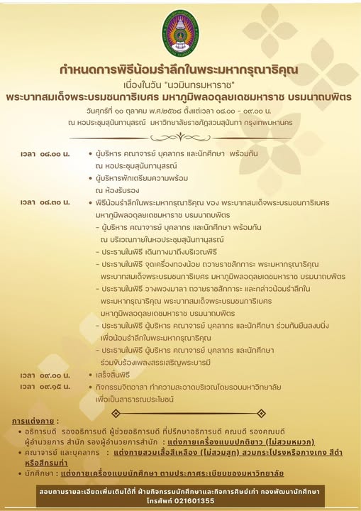10 ต.ค. นี้ เชิญร่วมพิธีน้อมรำลึกเนื่องในวัน "นวมินทรมหาราช" และกิจกรรมจิตอาสาโดยรอบมหาวิทยาลัย