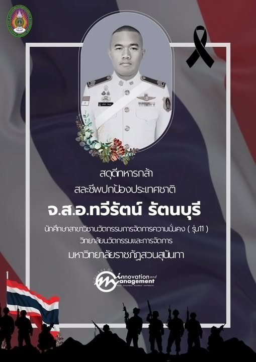 มหาวิทยาลัยราชภัฏสวนสุนันทาขอร่วมแสดงความอาลัยและสดุดีวีรกรรมของ “จ.ส.อ.ทวีรัตน์ รัตนบุรี” สังกัดกองพันจู่โจม ผู้เสียสละชีวิตในการปฏิบัติหน้าที่ ณ สมรภูมิเนิน 677 ช่องอานม้า