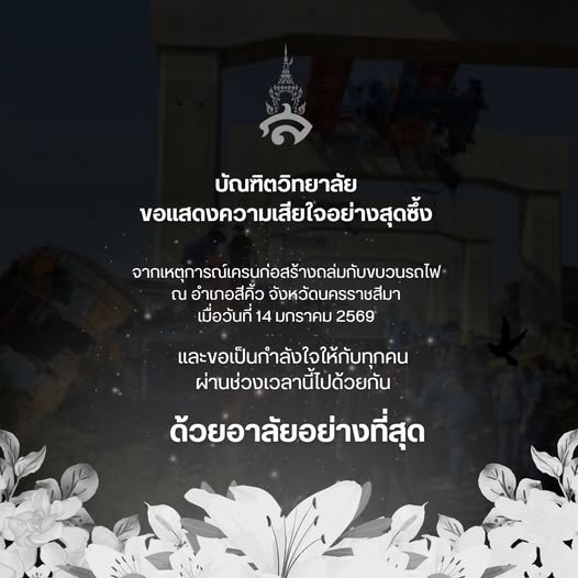 บัณฑิตวิทยาลัย ขอแสดงความเสียใจอย่างสุดซึ้งต่อครอบครัวผู้สูญเสีย และผู้ที่ได้รับผลกระทบจากเหตุการณ์เครนก่อสร้างถล่มทับขบวนรถไฟ ณ อำเภอสีคิ้ว จังหวัดนครราชสีมา เมื่อวันที่ 14 มกราคม 2569 ที่ผ่านมา